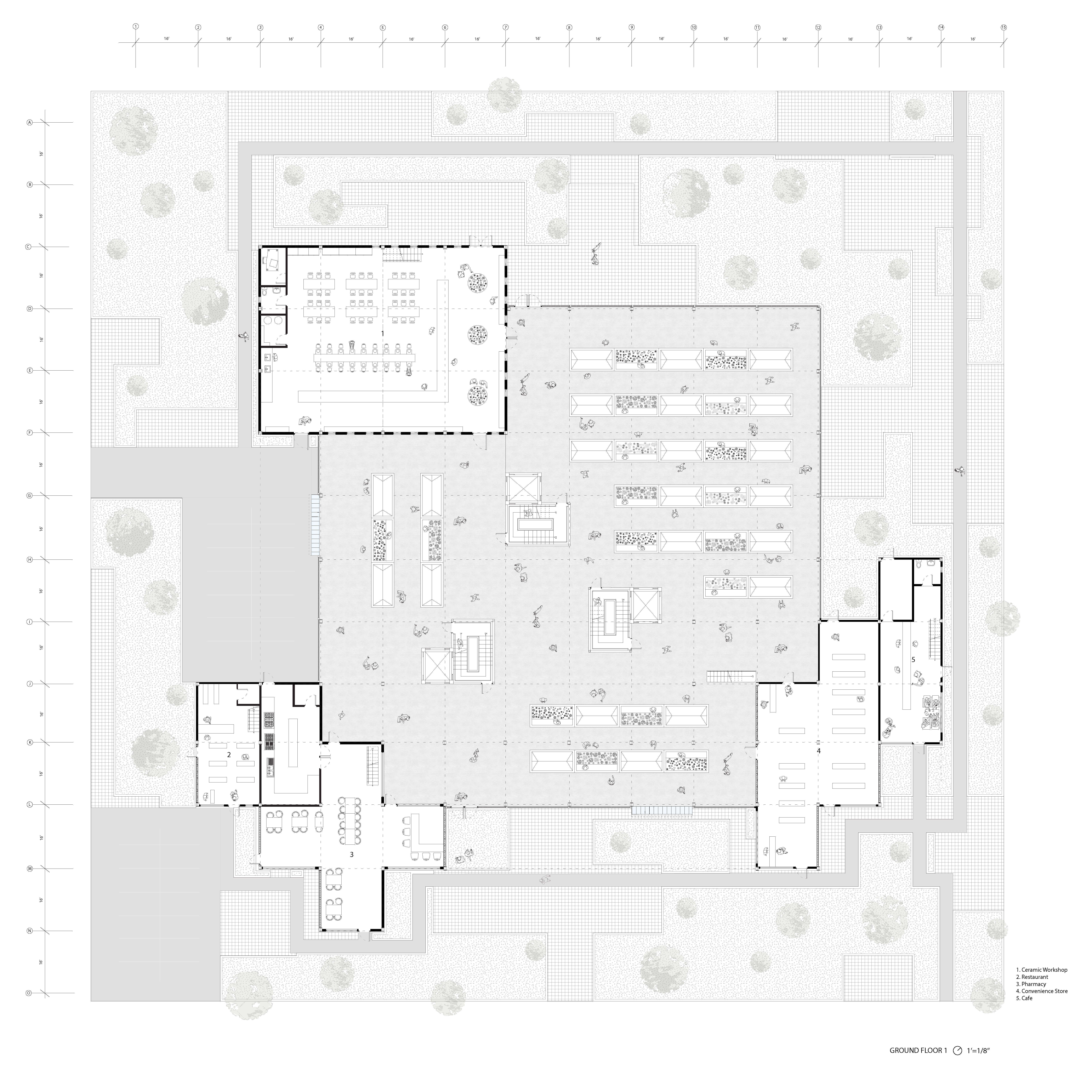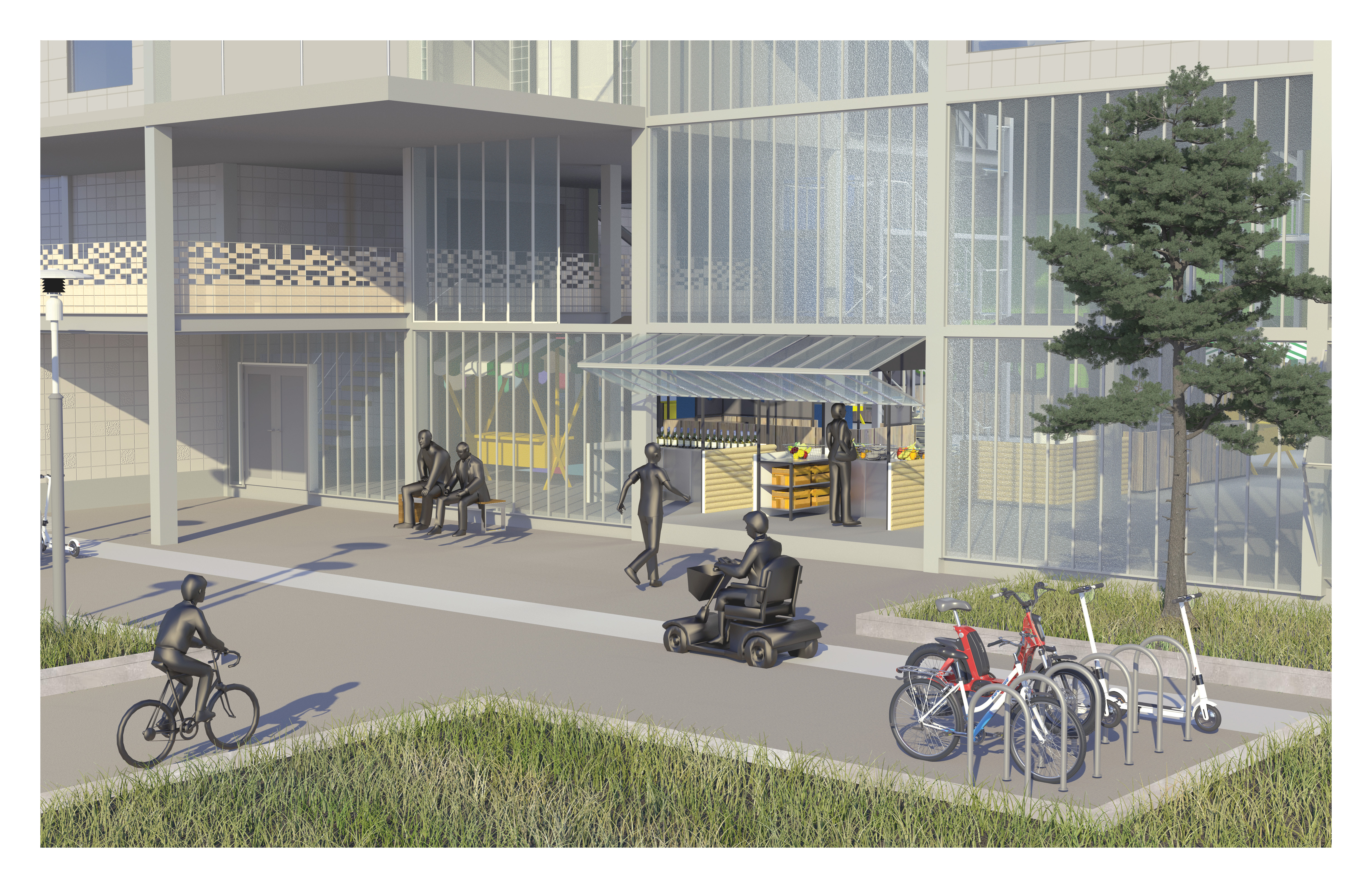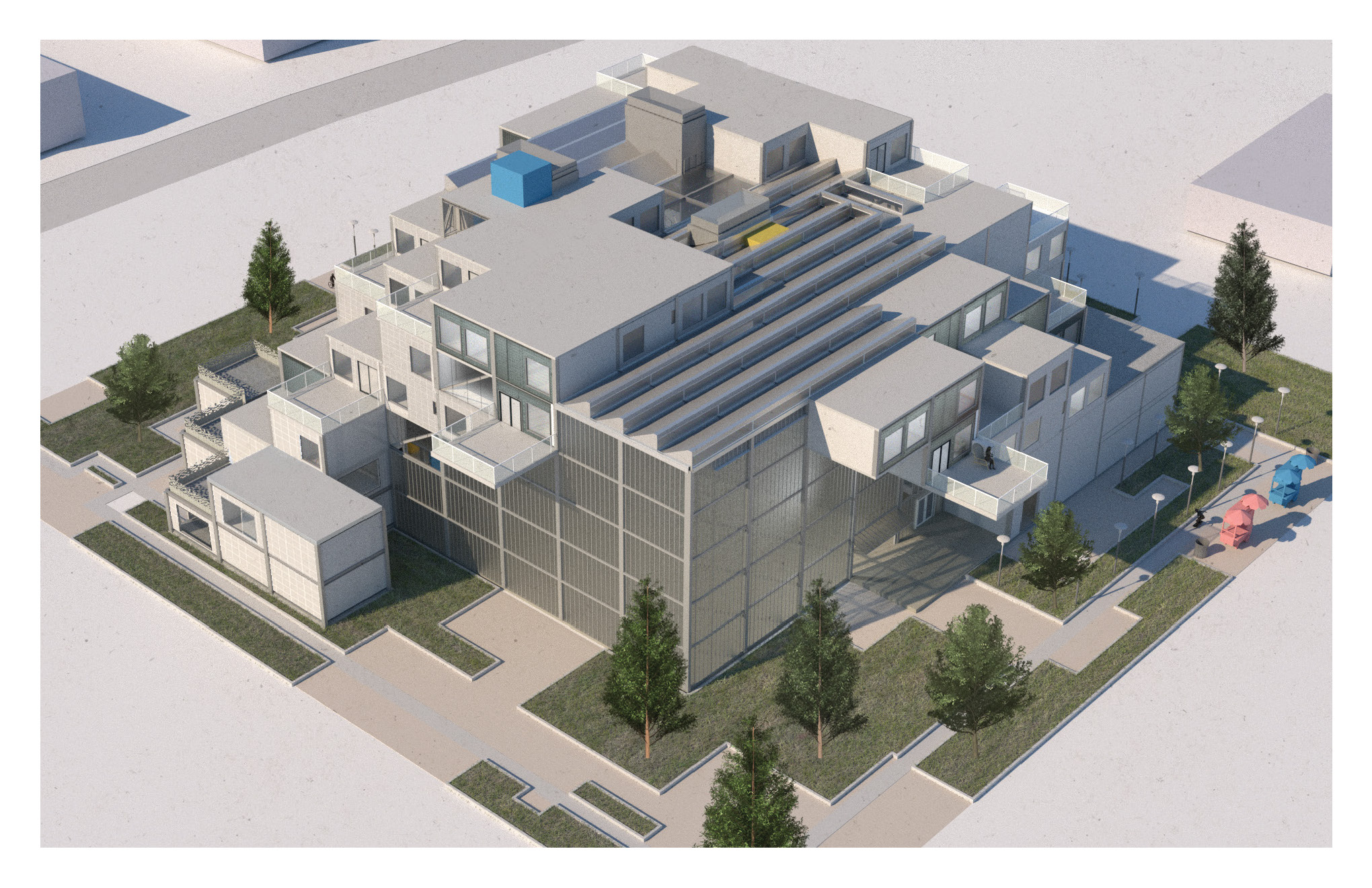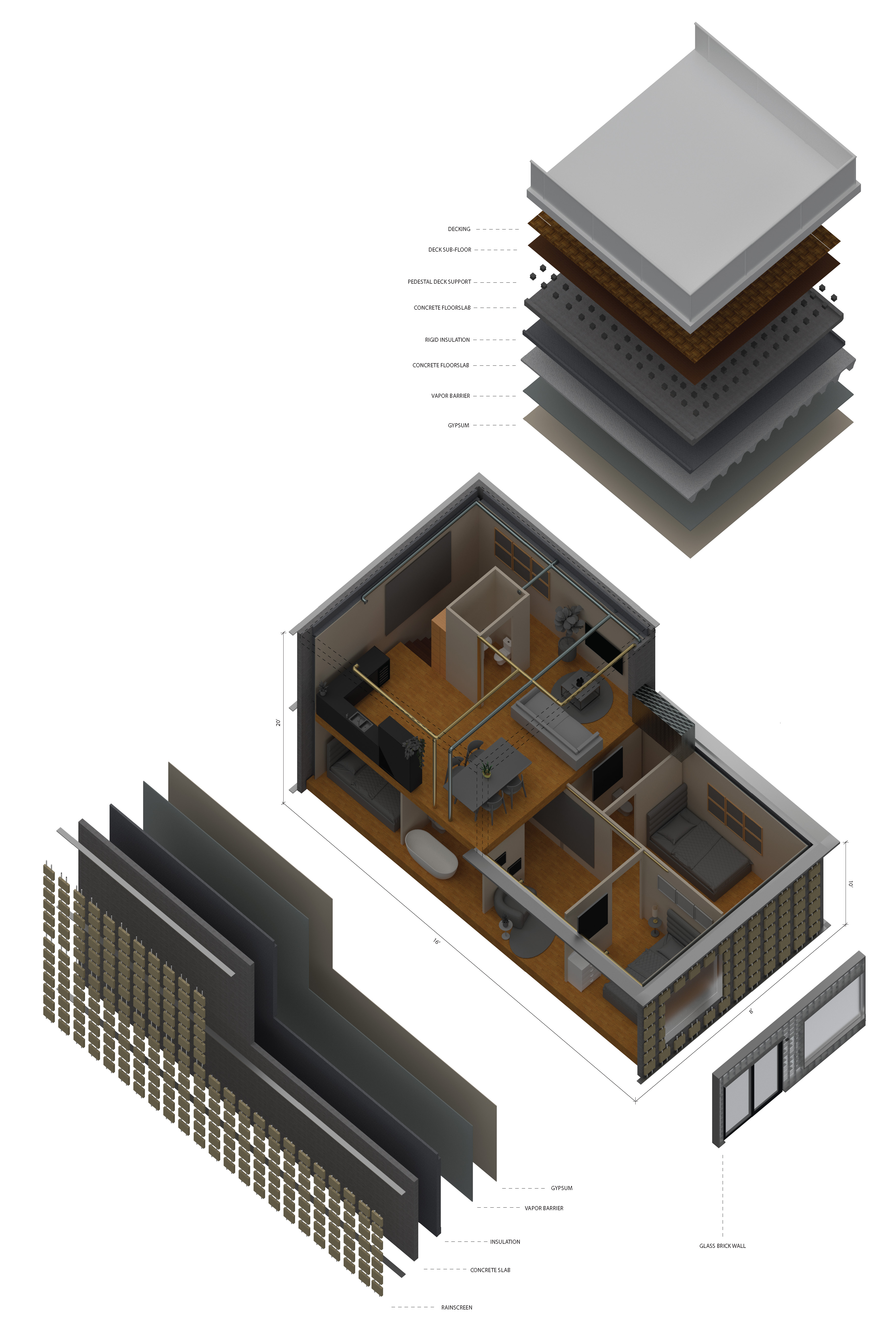 In response to the housing crisis, this project explores an alternative residential model that combines affordable living with community-centered commerce. The design integrates all major building systems including structure, HVAC, egress, and code compliance, within a modular framework. A mix of one- to four-bedroom units is arranged on an 8′ x 8′ grid to prioritize privacy and adaptability. Precast concrete panels, ceramic rain-screen cladding, and frosted glass define each unit, while a central atrium with an operable enclosure supports market stalls and shared circulation. This project marks a first step in designing fully integrated architecture in collaboration with interdisciplinary consultants.